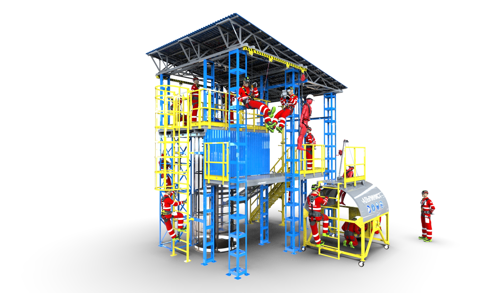 Масштабный комплексный тренажер успешно смонтирован и готов к занятиям – первая практическая демонстрация проведена для группы из 40 сотрудников, ответственных за организацию и проведение работ на высоте. Тренажер позволяет моделировать сложные условия проведения работ, а также отрабатывать применение средств индивидуальной защиты, систем крепления и страховки.
